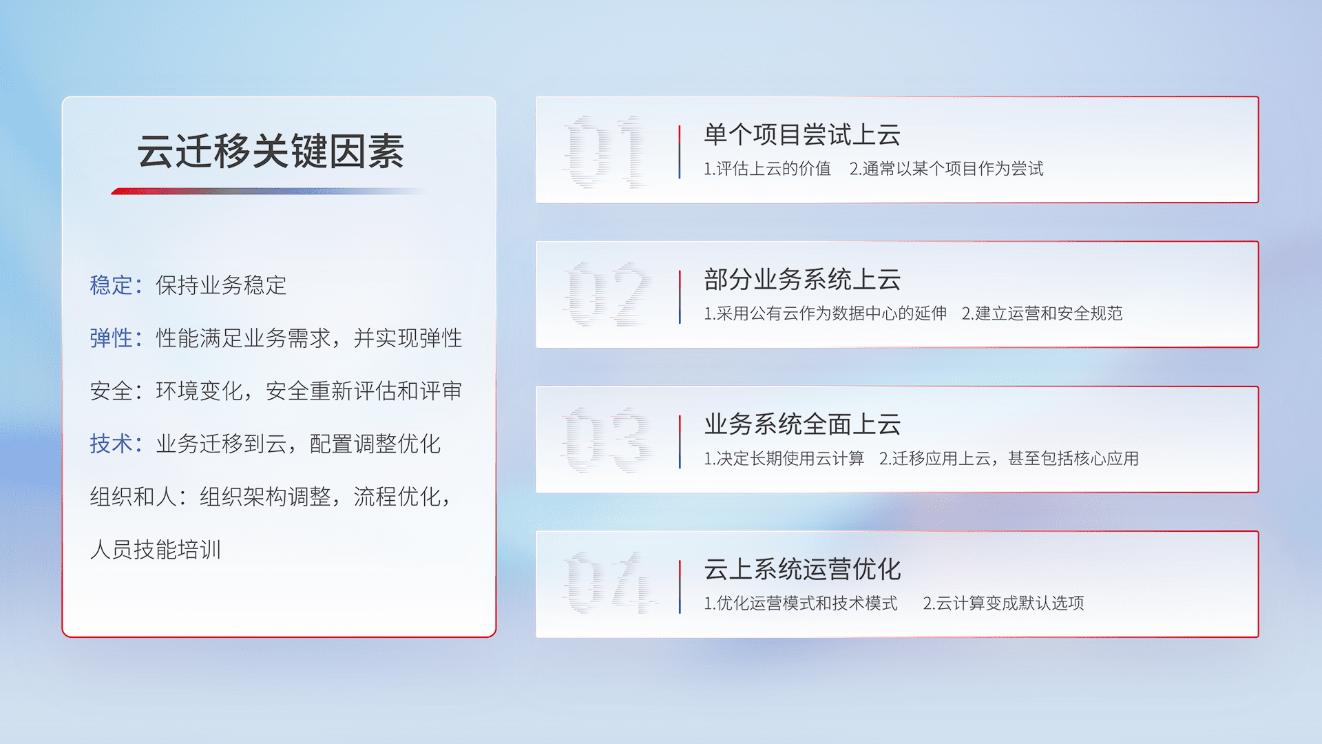 结合实际业务,,,,从规划设计、、、、云平台选型、、、云原生改造、、数据迁移、、、集成交付,,,迁移全过程为客户识别最佳上云路径,,,做好风险识别管理,,,,设计网络架构、、身份权限、、、安全审计合规、、、、操作审计、、日志审计、、监控告警策略、、、多站点容灾设计等,,,对云上基础设施进行整体规划,,,,提升IT治理水平,,,以满足弹性、、、高可用、、、、高性能的需求。。